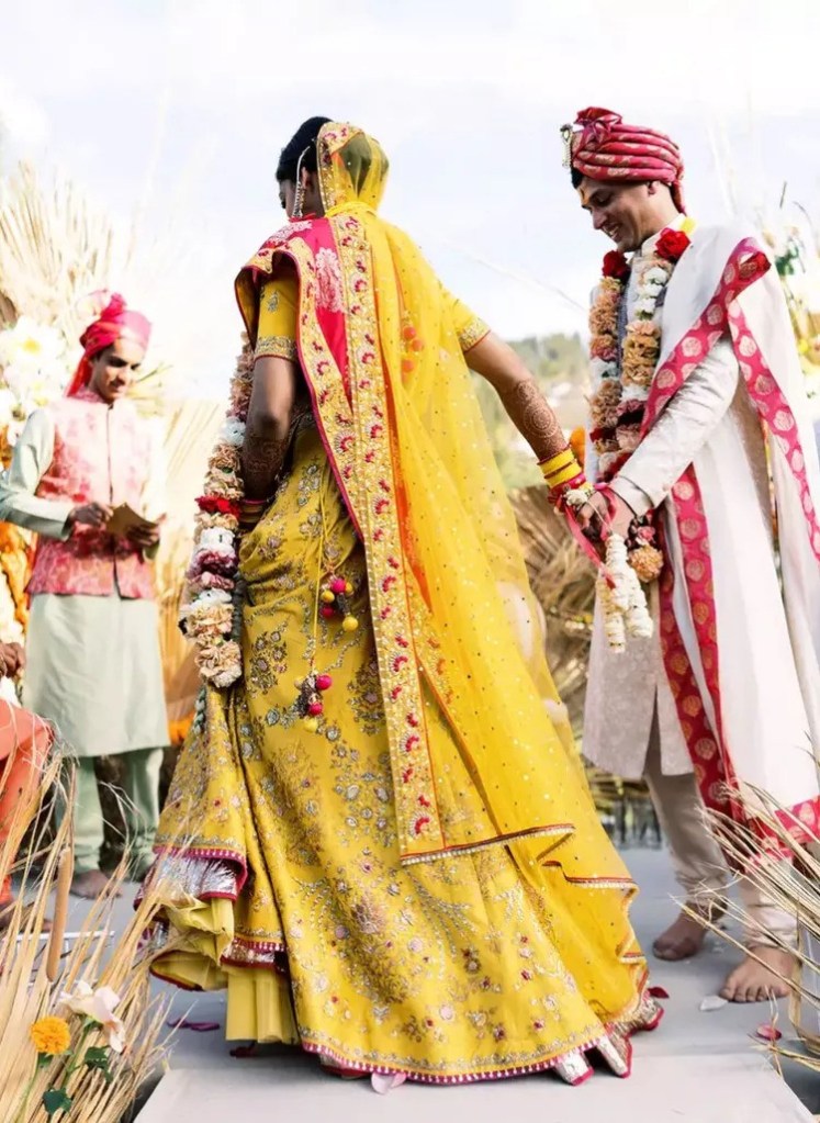 Another Hindu tradition at weddings involves the couple taking seven steps for the Saptapadi. Sonal J. Shah, a wedding planner for the South Asian community in the U.S, said, “Someone from the wedding party, typically the groom’s brother, will spread out seven stones in a straight line, and the couple will move from stone to stone, touching each with their toes, as the pandit, reads the seven verses.”